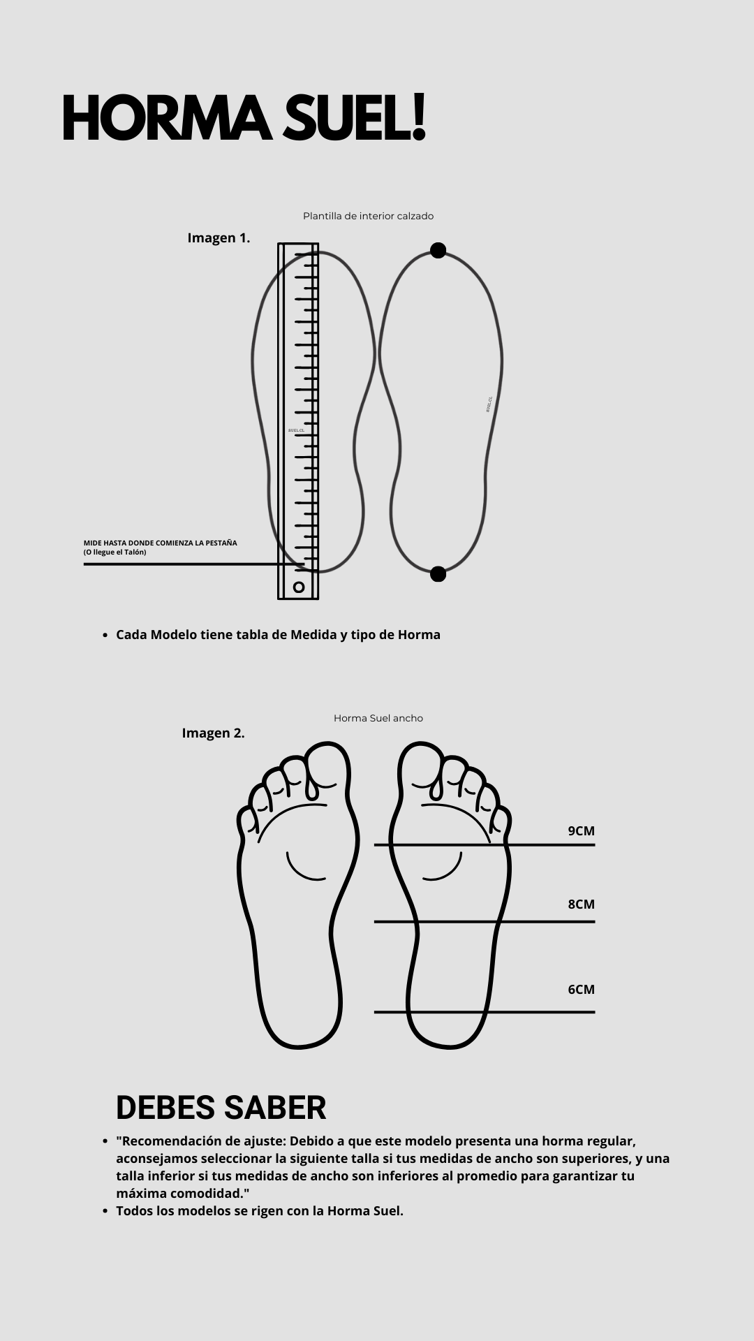 Todos los modelos en el sitio Web tienen su tipo de horma, esta Horma se basa en la imagen 2 (Horma Suel ancho). Es decir si tu medida no concuerda con el Ancho de la imagen de referencia debieras ser una talla más o una talla menos a lo que dice en la descripción del modelo, pero si tus medidas concuerdan con la imagen 2 debes comprar según el tipo de horma que indica el modelo.
